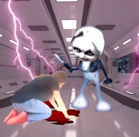 В пустом холодном, в плохо освещённом коридоре стали появляться электрические искры исходящие снизу. Через мгновение искры становились более агрессивнее, образуя множество импульсов. Коридор технического отсека осветило синим светом. В центре вереницы электрических зарядов образовался предмет, яйцевидной формы. Внутри стал виден человеческий силуэт. Выйдя за пределы, яйцо лопнуло.